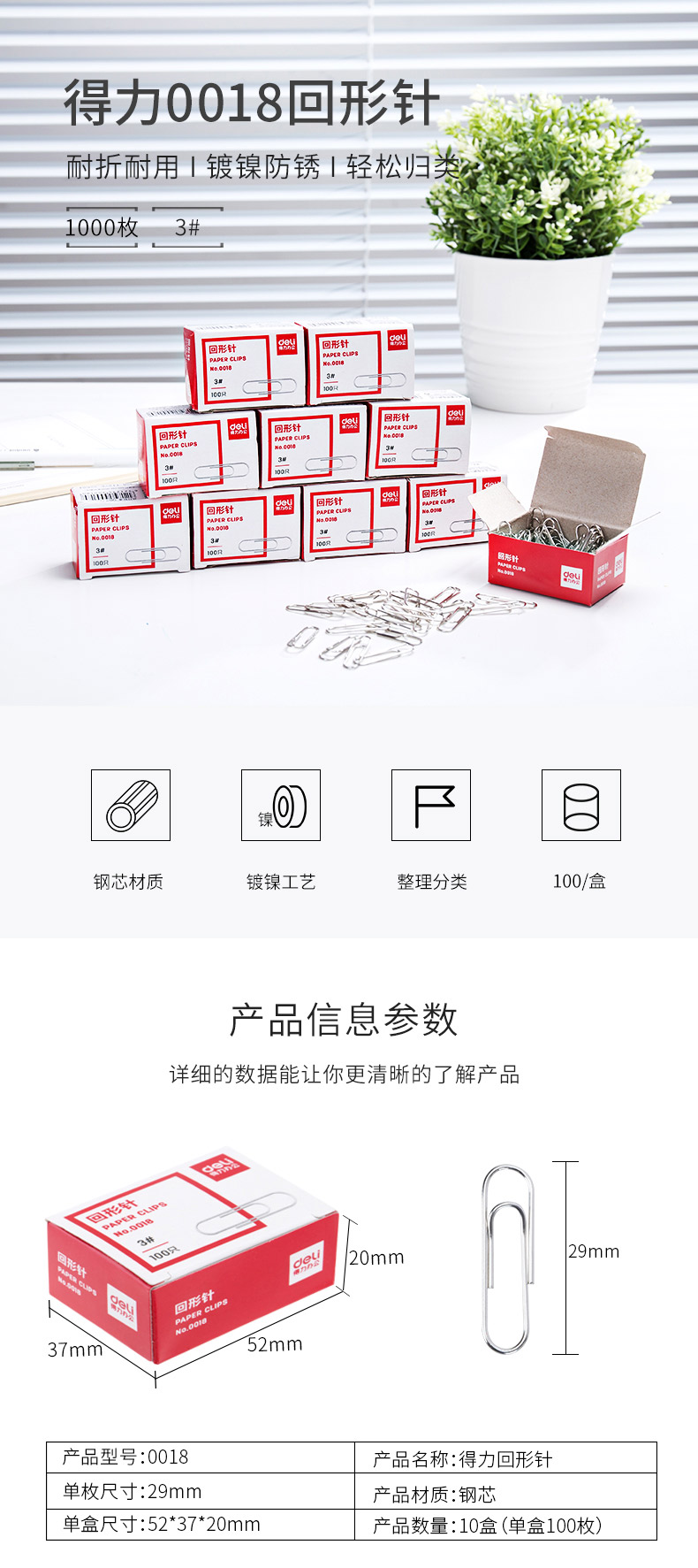 參數(shù) [品牌] 得力(deli) [型號] 0018 [毛重] 300G [產(chǎn)地] 中國大陸 [類型] 辦公用品 [單位] 盒 [材質(zhì)] 鐵鍍鎳表層